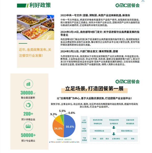 GMC团餐会,是融“学校、医院、机关、园区、大型企业等终端应用场景领导”、“团餐服务企业及产业链头部企业家”、 “团餐领域知名专家、学者”等三大核心资源池于一体的专业组织机构,助力智慧食堂建设及团餐服务高质量发展。 GMC团餐会旗下“2024数字团餐暨智慧食堂博览会”是由灵硕展览集团联合中国食药促进会主办,中国食药促进会 预制菜与智慧团餐专委会、上海傲展会展服务有限公司等承办,全国各地餐饮相关协会协办,数家国内外知名团餐 服务公司为支持单位,以全新理念打造的团餐领域品牌展会。 展会集中展示团餐服务、食材供应链、智慧食堂等团餐全产业链产品、设备及服务解决方案。依托展会聚焦“终端”, 以“应用场景”为中心的办展理念,基于校园团餐优势,GMC力争成为国内最大的品牌团餐展会! 展会汇聚团餐公司,学校、企事业单位、政企机关、医院、社区养老机构,团餐产业上下游企业等,搭建行业内交流平 台,助推团餐产业上下游深度合作,共同挖掘团餐行业万亿蓝海市场。