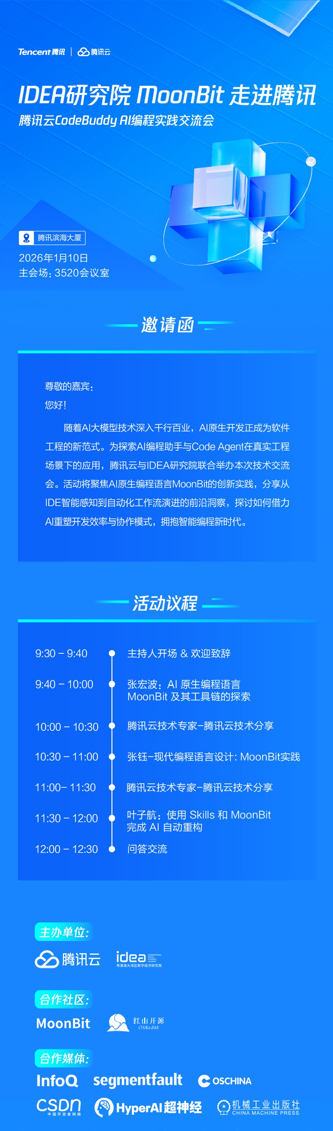 随着AI大模型技术深入干行百业,AI原生开发正成为软件工程的新范式。为探索AI编程助手与Code Agent在真实工程场景下的应用,腾讯云与IDEA研究院联合举办本次技术交流会。活动将聚焦AI原生编程语言MoonBit的创新实践,分享从IDE智能感知到自动化工作流演进的前沿洞察,探讨如何借力AI重塑