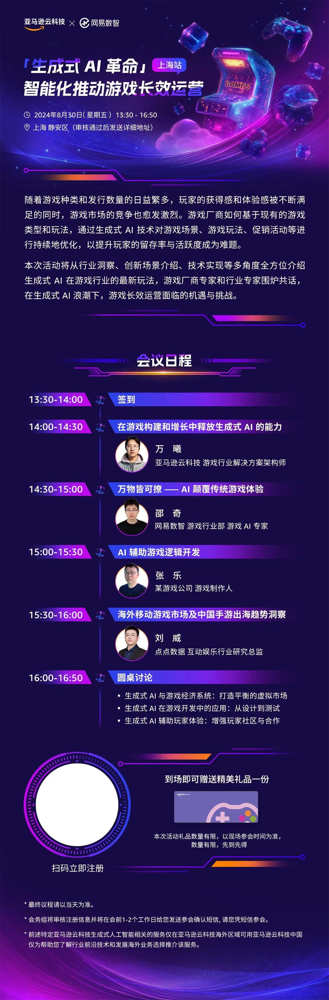本次活动将从行业洞察、创新场景介绍、技术实现等多角度全方位介绍生成式 AI 在游戏行业的最新玩法,游戏厂商专家和行业专家围炉共话,在生成式 AI 浪潮下,游戏长效运营面临的机遇与挑战。