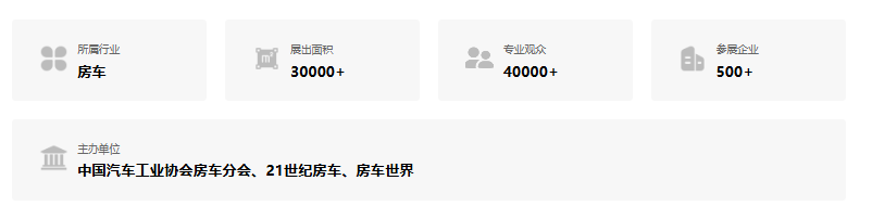亚洲专业的房车露营主题展,汇集国内外知名品牌,房车户外露营全产业链集中展示,房车露营产业发展的风向标,已连续举办13年,迄今已成功举办24届,单场展览面积超10万平米,单场接待观众超9万人次。展示品类涵盖房车、配件商、营地等全体系。强大精准数据库覆盖数10万+专业观众,优质终端买家,成交量庞大业界关注度高。同期举办行业相关技术交流发展论坛,车友经验分享会,搭建全方位房车交流平台。