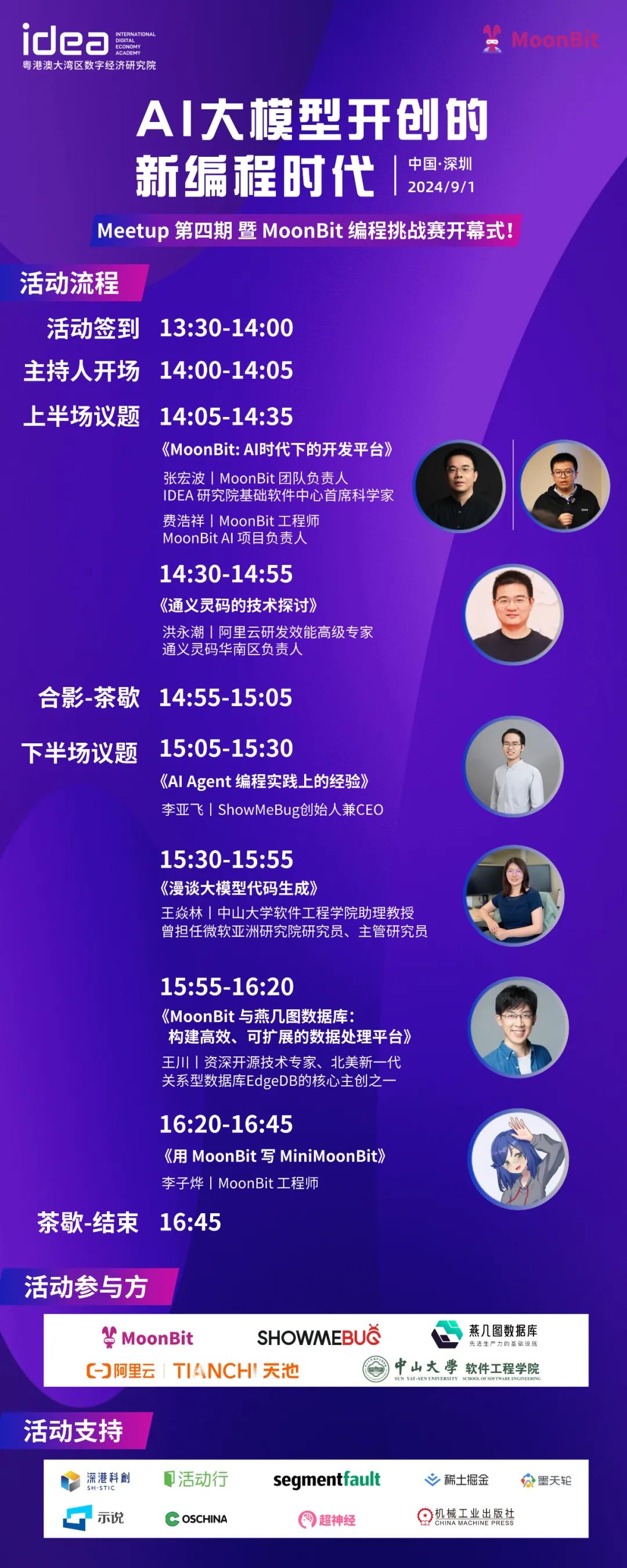 MoonBit 第四期 Meetup 来啦!2024年9月1日,MoonBit 将携手多位专家、老师在深圳这座创新的城市,举办 Meetup 第四期暨 MoonBit 编程挑战赛开幕式!继6月底北京的基础软件技术前沿对话后,我们再次集结,这一次,我们将深入探讨AI大模型在编程领域的革命性应用,从基础软件到 AI 编程实践,全方位覆盖技术热点。