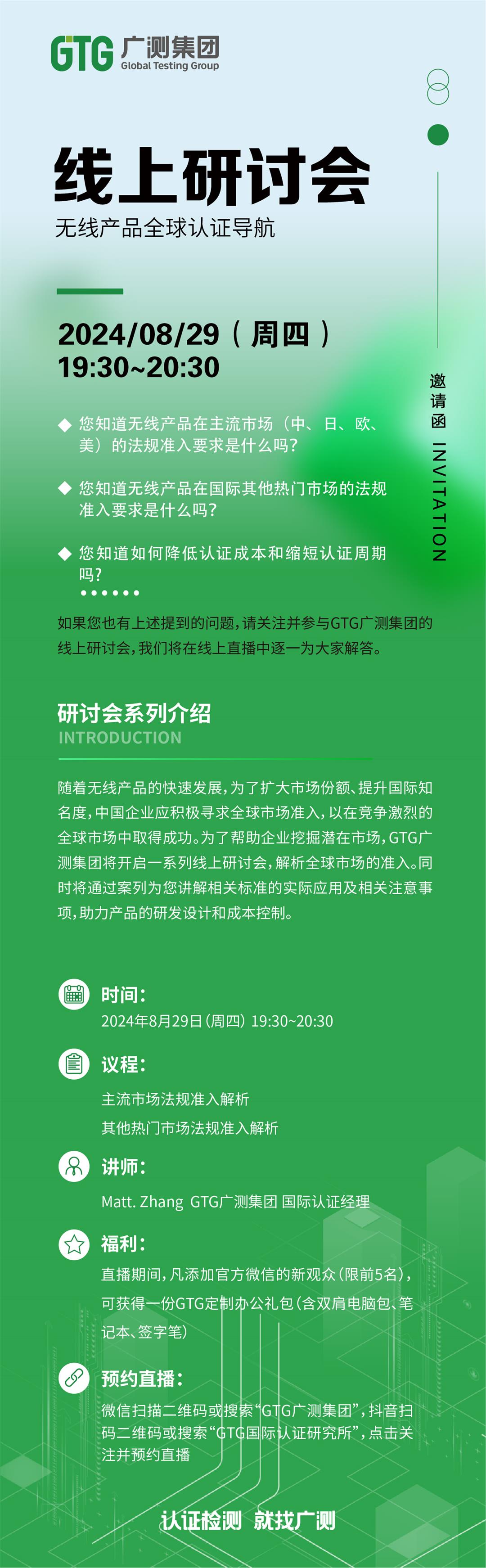 全球市场中取得成功。为了帮助企业挖掘潜在市场,GTG广测集团将开启一系列线上研讨会,解析全球市场的准入。同时将通过案列为您讲解相关标准的实际应用及相关注意事项,助力产品的研发设计和成本控制。