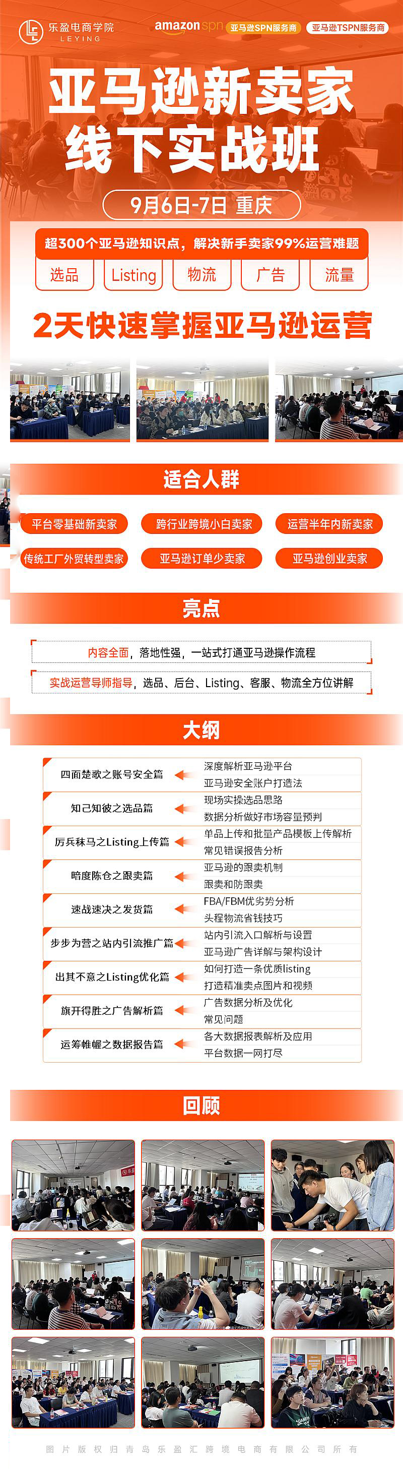 行业内的口碑保证,亚马逊官方SPN服务商乐盈电商学院来了!完善科学的系统化实操课程,亚马逊一线实操经验的讲师团队,让你两天读懂亚马逊!