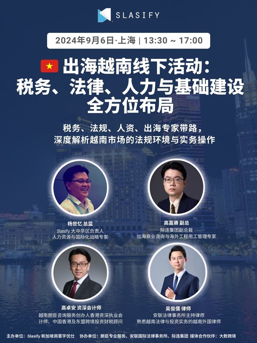 作为东南亚新兴市场的领头羊,越南正迅速成为全球企业的关注焦点。然而,成功进军并在这个充满机遇的市场中稳步发展,企业需要深入了解并掌握当地的法律法规、税务制度、人力资源管理及基础设施建设。为帮助企业在越南市场抢占先机,既线上活动之后,Slasify又精心策划了这场「出海越南二部曲」线下活动,诚邀您亲临现场,与各领域的顶尖专家面对面交流,获取最新的市场洞察与宝贵的实战经验。9月6日,上海,我们不见不散!