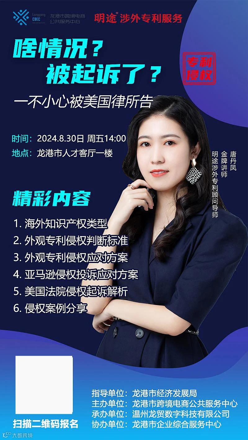 精彩内容1.海外知识产权类型2.外观专利侵权判断标准3.外观专利侵权应对方案4.亚马逊侵权投诉应对方案5. 美国法院侵权起诉解析6.侵权案例分享