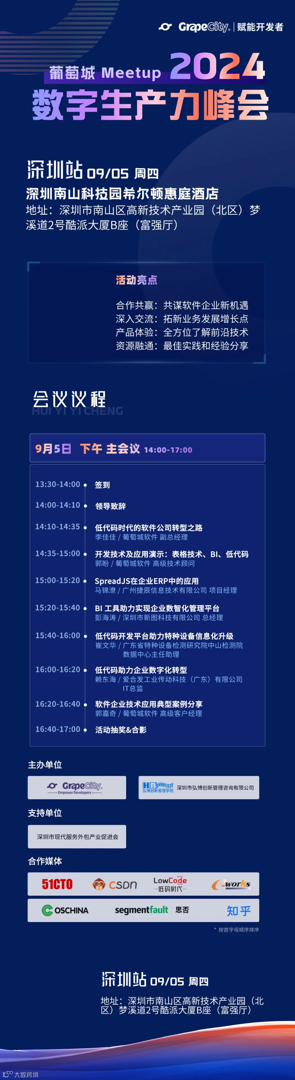 2024“数字生产力”峰会·深圳站,由西安葡萄城软件有限公司、深圳市弘博创新管理咨询有限公司联合主办,深圳市现代服务外包产业促进会支持。活动将邀请行业先行者分享技术应用和场景案例,围绕软件企业的机遇和挑战、软件业务的发展增长以及低代码、BI和表格技术等话题进行深入探讨。