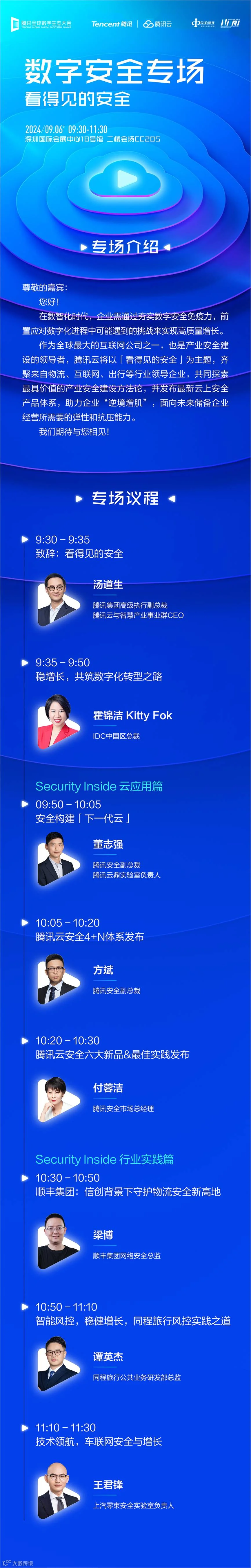作为全球最大的互联网公司之一,也是产业安全建设的领导者,腾讯云将以「看得见的安全」为主题,齐聚来自物流、互联网、出行等行业领导企业,共同探索最具价值的产业安全建设方法论,并发布最新云上安全产品体系,助力企业“逆境增肌”,面向未来储备企业经营所需要的弹性和抗压能力。