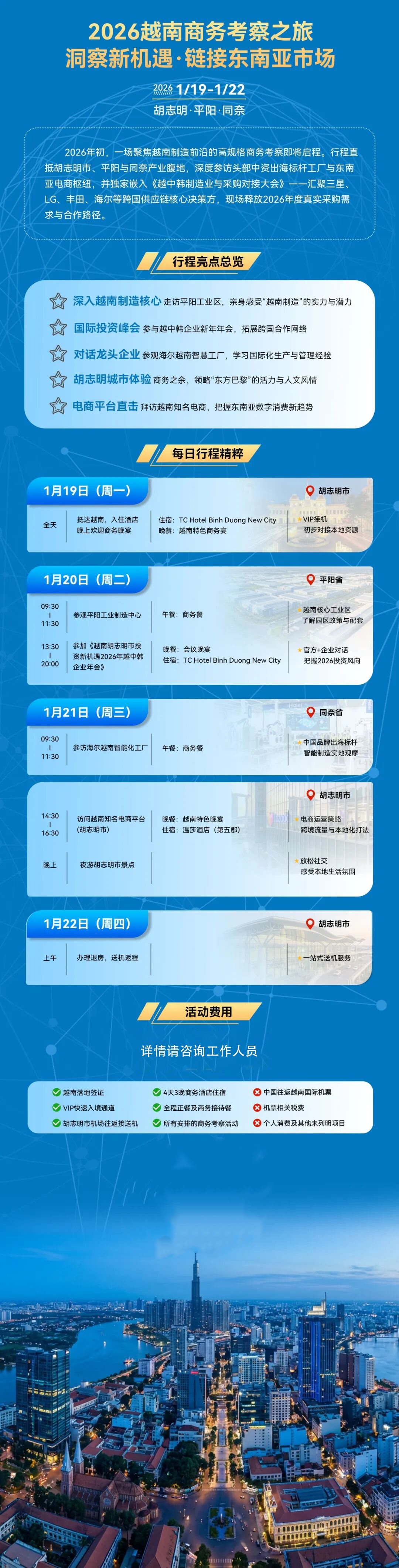 2026年初,聚焦越南制造前沿的高规格商务考察启程,行程包括胡志明市、平阳与同奈产业腹地,深度参访头部中资出海标杆工厂与东南亚电商枢纽,并嵌入《越中韩制造业与采购对接大会》,汇聚跨国供应链核心决策方,释放2026年度真实采购需求与合作路径。