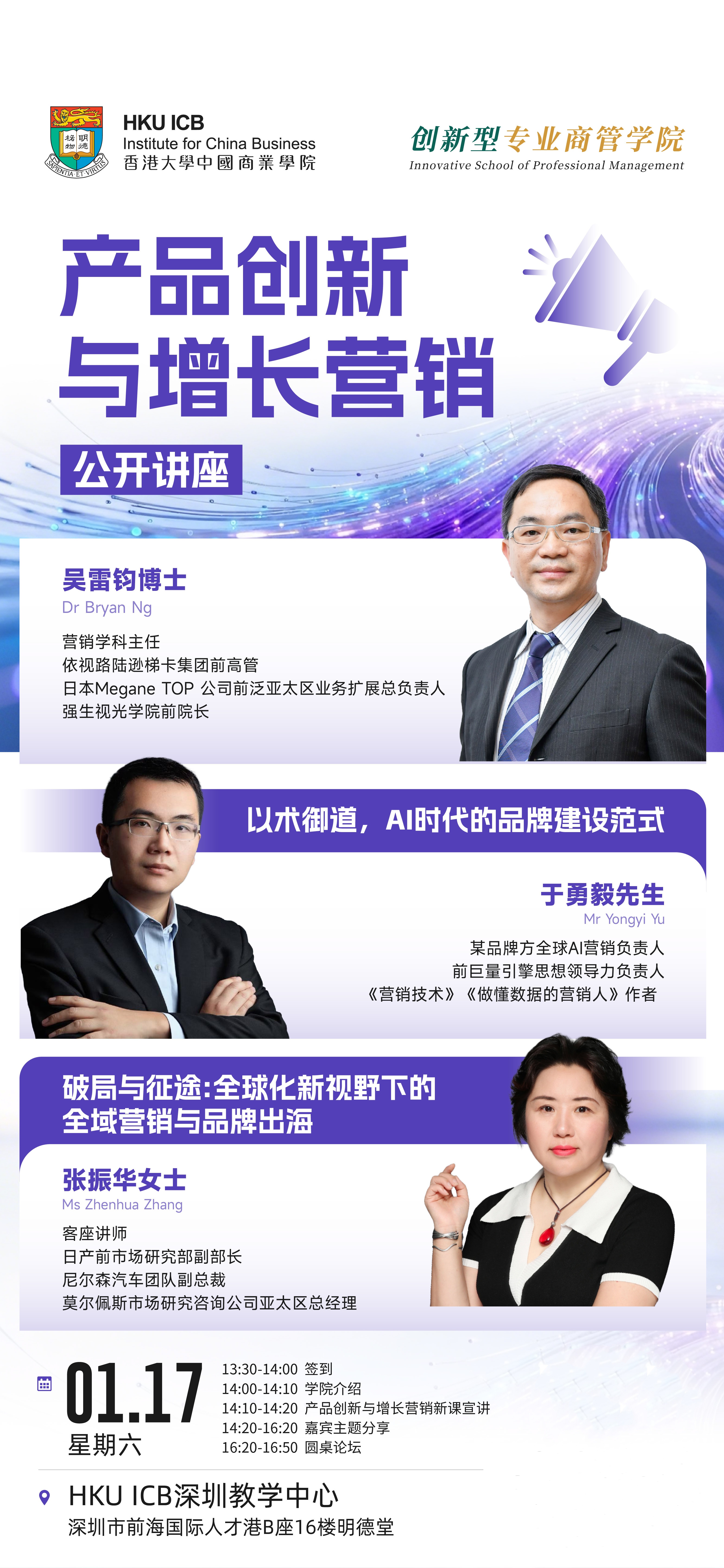 1.17深圳教学中心,拆解产品创新+增长营销底层逻辑,AI时代品牌建设、全球化全域营销两大核心议题,行业大咖面对面分享实战心法。