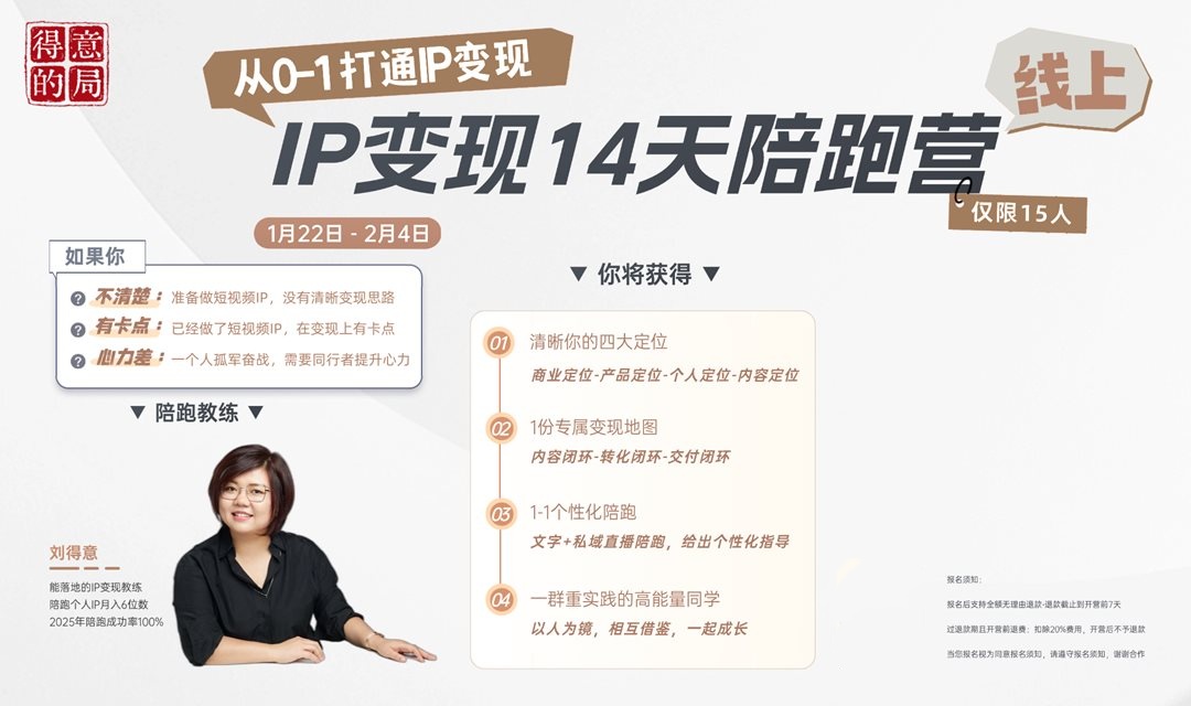 针对短视频IP变现有困惑的人群,提供14天陪跑服务,包括清晰四大定位(商业定位、产品定位、个人定位、内容定位),提供专属变现地图(内容闭环、转化闭环、交付闭环),1-1个性化陪跑(文字+私域直播陪跑),并有一群重实践的高能量同学一起成长。