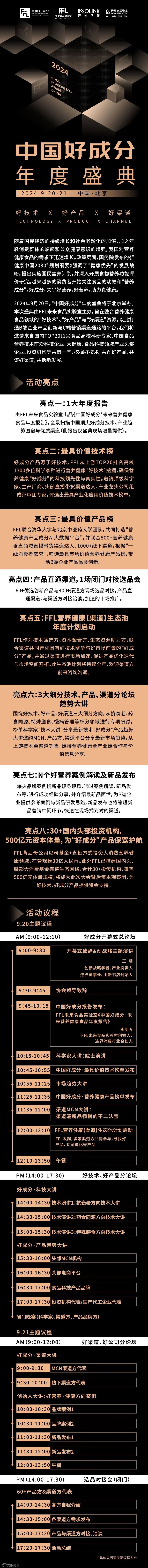 2024年9月20日-21日,"中国好成分"年度盛典将于北京举办。本次盛典由FFL未来食品实验室主办,旨在整合营养健康食品领域的“好技术”、“好产品”与“好渠道”资源,以此打通B端企业产品创新与C端营销渠道通路的平台。我们将邀请来自国内TOP20顶尖食品高校科研专家、400+渠道方、中国食品营养技术前沿科技企业,大健康、食品科技领域产业头部企业、投资机构、顶尖MCN渠道公司共聚一堂,挖掘好技术,共创好产品,共谋好渠道,共话新发展。