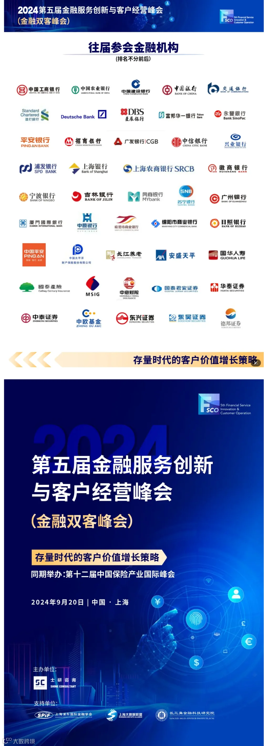 2024第五届金融服务创新与客户经营峰会将在9月20日上海盛大开幕!本次峰会以“存量时代的客户价值增长策略”为主题,共同探讨金融科技创新赋能金融行业客户经营新篇章!详情如下。