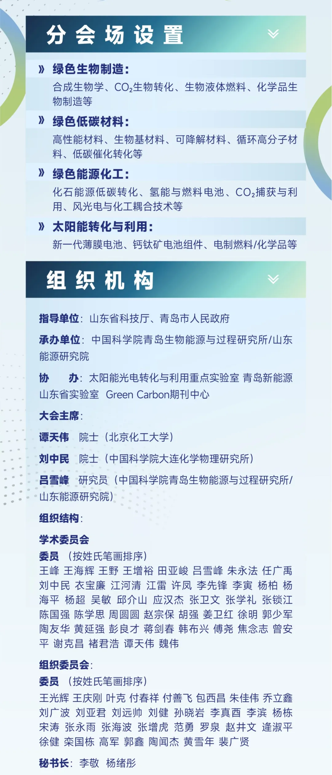 大会面向国家“碳达峰、碳中和”重大需求和世界科技前沿,围绕全球及我国能源产业绿色低碳转型发展中的热点、重点、难点问题,聚焦碳资源、低碳转化技术、多能融合与利用等主题,设立绿色生物制造,绿色低碳材料,绿色能源化工,太阳能转化利用技术、清源学者论坛、研究生沙龙、期刊论坛等特色分会,采取大会特邀报告、分会主题报告、口头报告、墙报、仪器、产品展示等多种模式。