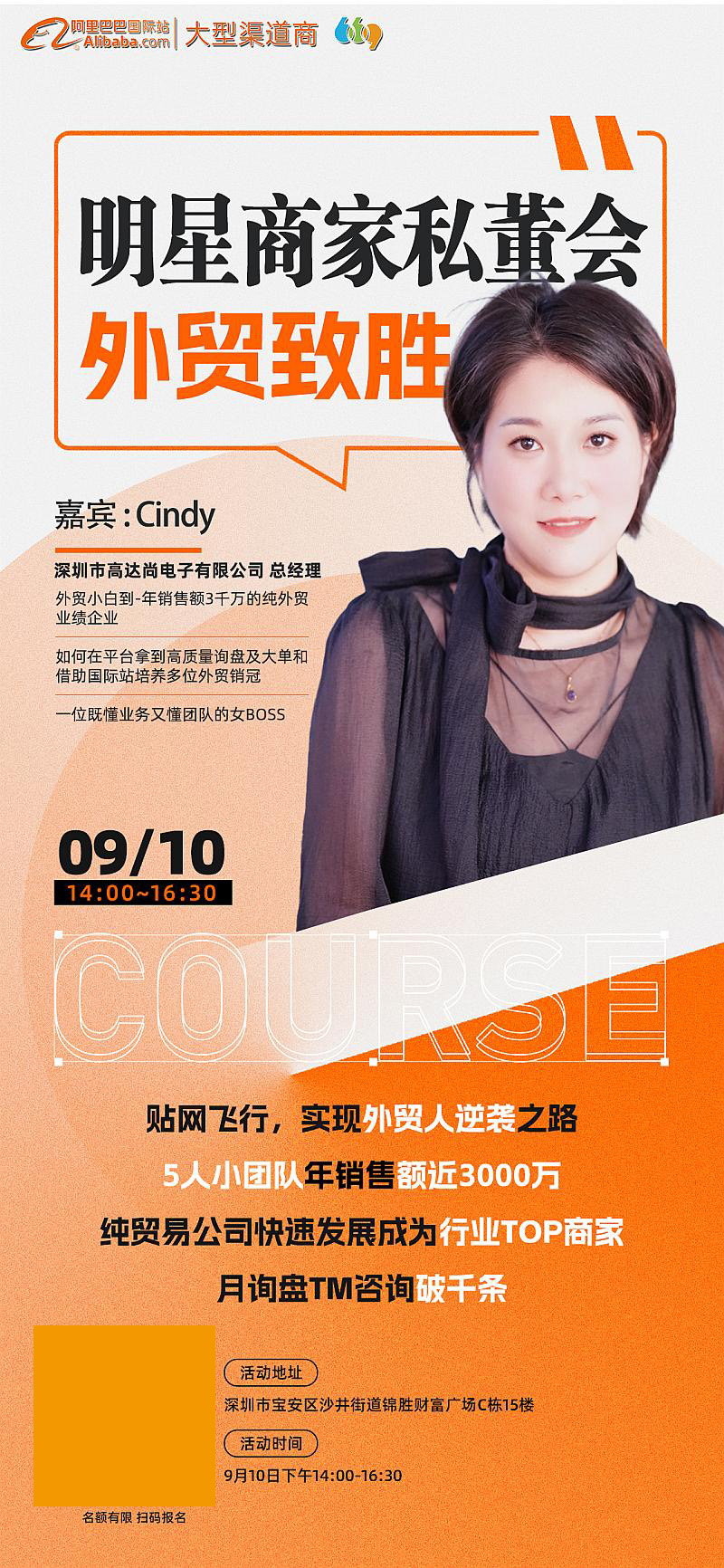 嘉宾:Cindy深圳市高达尚电子有限公司 总经理外贸小白到-年销售额3千万的纯外贸业绩企业如何在平台拿到高质量询盘及大单和借助国际站培养多位外贸销冠一位既懂业务又懂团队的女BOSS