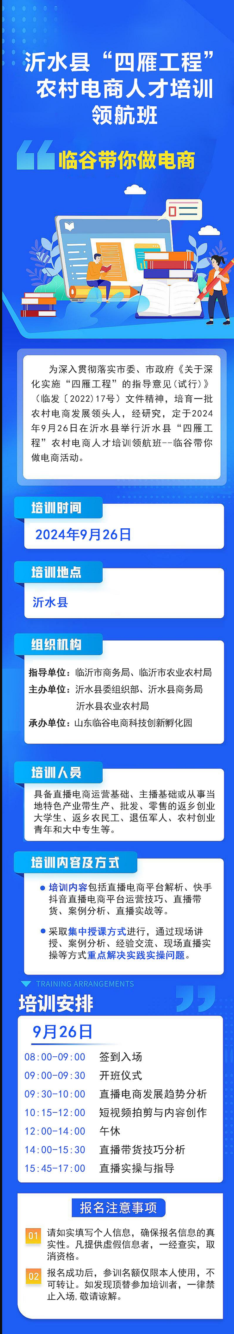 (临发〔2022)17号)文件精神,培育一批农村电商发展领头人,经研究,定于2024年9月26日在沂水县举行沂水县“四雁工程”农村电商人才培训领航班--临谷带你做电商活动。