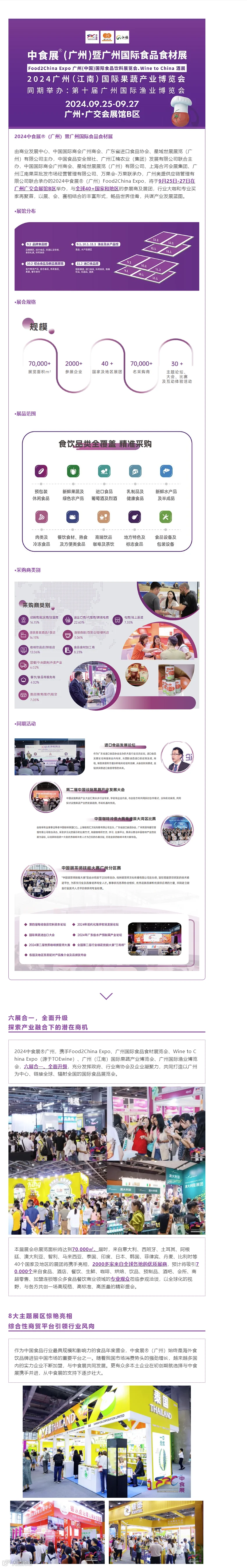 由商业发展中心、中国国际商会广州商会、广东省进口食品协会、星域世展展览(广州)有限公司主办,中国食品安全报社、广州江楠农业(集团)发展有限公司联合主办,中国国际商会广州商会、星域世展展览(广州)有限公司、上海合河会展集团、广州江南果菜批发市场经营管理有限公司、万果会-万果联承办,广州奥盛供应链管理有限公司联合承办的2024中食展®(广州)Food2China Expo,将于9月25日-27日在广州广交会展馆B区举办,与全球40+国家和地区的参展商及展团,行业大咖和专业买家再聚首,以展、会、赛相结合的丰富形式,畅品世界佳肴,共谋产业发展蓝图。