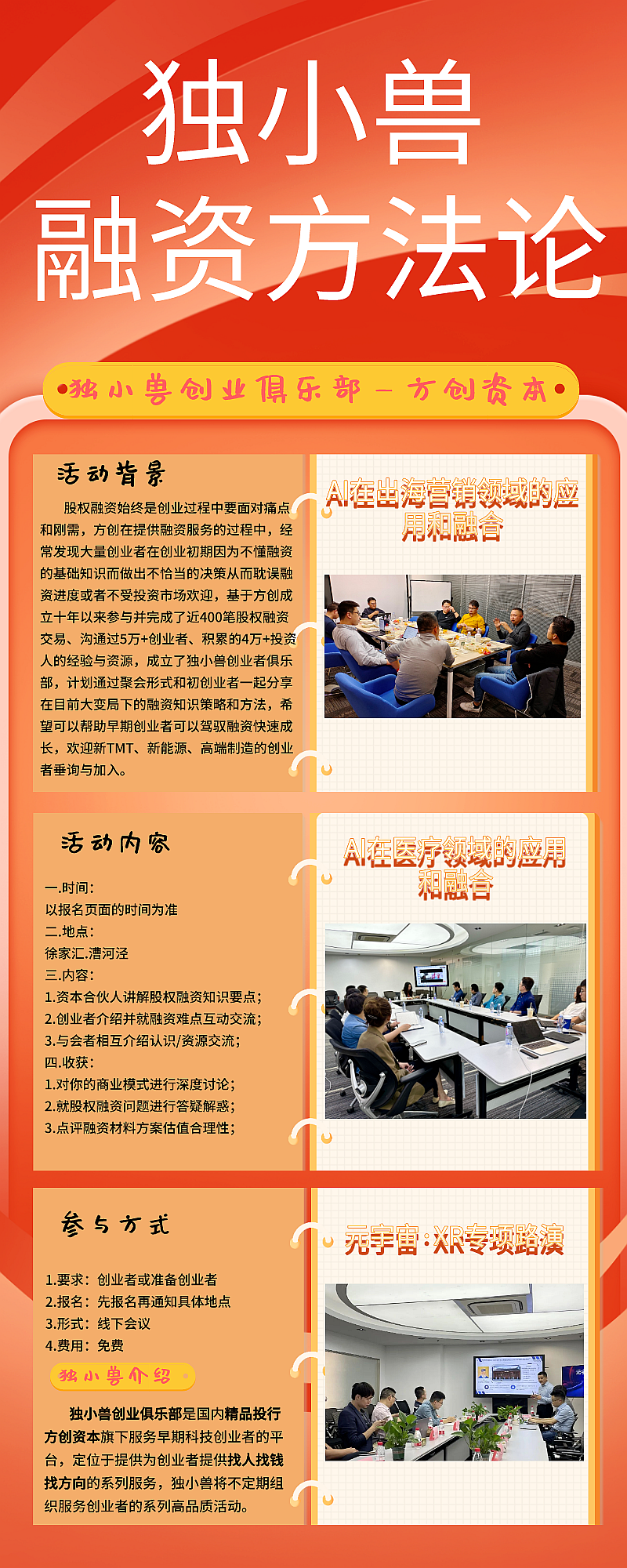 股权融资始终是创业过程中要面对痛点和刚需,方创在提供融资服务的过程中,经常发现大量创业者在创业初期因为不懂融资的基础知识而做出不恰当的决策从而耽误融资进度或者不受投资市场欢迎,基于方创成立十年以来参与并完成了近400笔股权融资交易、沟通过5万+创业者、积累的4万+投资人的经验与资源,成立了独小兽创业者俱乐部,计划通过聚会形式和初创业者一起分享在目前大变局下的融资知识策略和方法,希望可以帮助早期创业者可以驾驭融资快速成长,欢迎新TMT、新能源、高端制造的创业者垂询与加入。