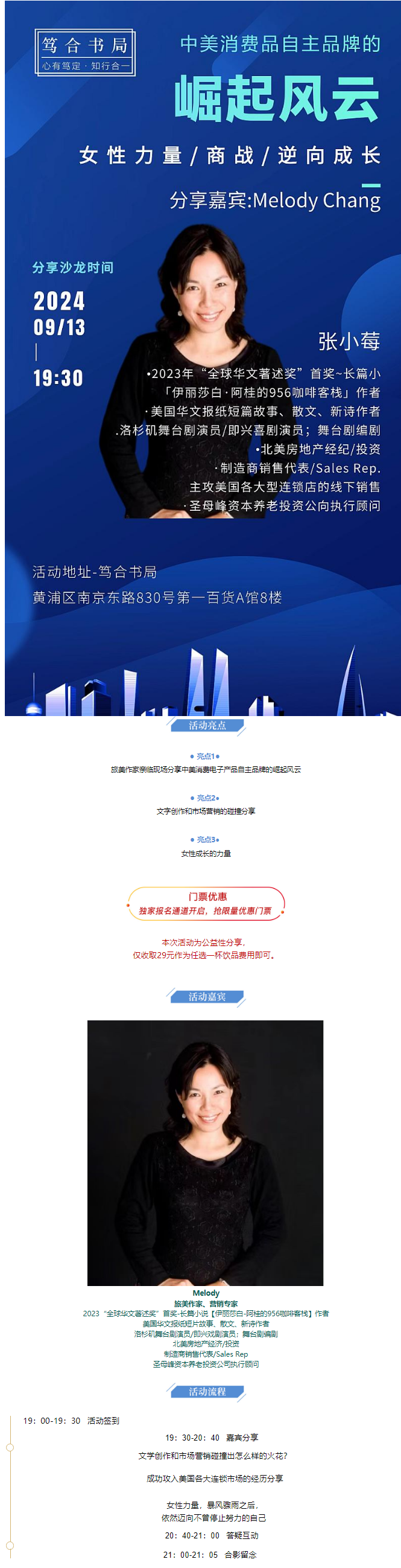 我们特邀旅美作家、营销专家Melody亲临笃合书局进行分享中美消费市场的崛起风云,不可错过!