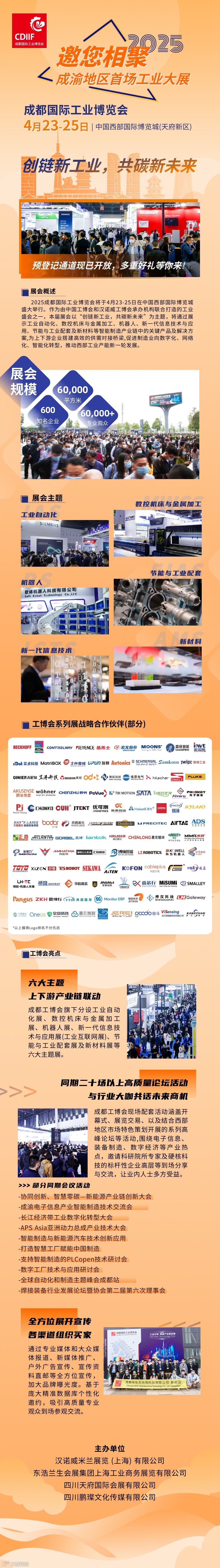 2025成都工博会以“创链新工业,共碳新未来”为主题,规划面积60,000平方米,预期汇集全球600多家工业领先企业,逾60,000名专业观众前往参观、采购。一场集产品展示、系列论坛、采供配对、交流合作等为主的大型现代工业技术博览会,期待您的到来!