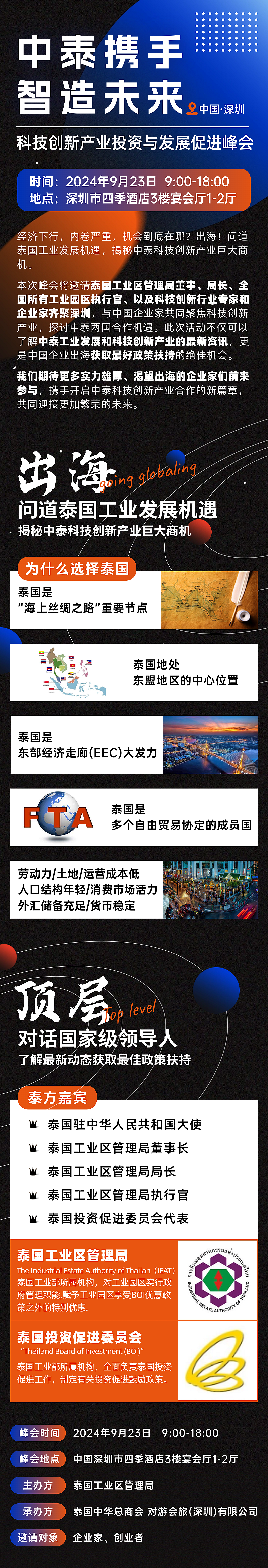 本次峰会将邀请泰国工业区管理局董事、局长、全国所有工业园区执行官、以及科技创新行业专家和企业家齐聚深圳,与中国企业家共同聚焦科技创新产业,探讨中泰两国合作机遇。此次活动不仅可以了解中泰工业发展和科技创新产业的最新资讯,更是中国企业出海获取最好政策扶持的绝佳机会,我们期待更多实力雄厚、渴望出海的企业家们前来参与,携手开启中泰科技创新产业合作的新篇章共同迎接更加繁荣的未来
