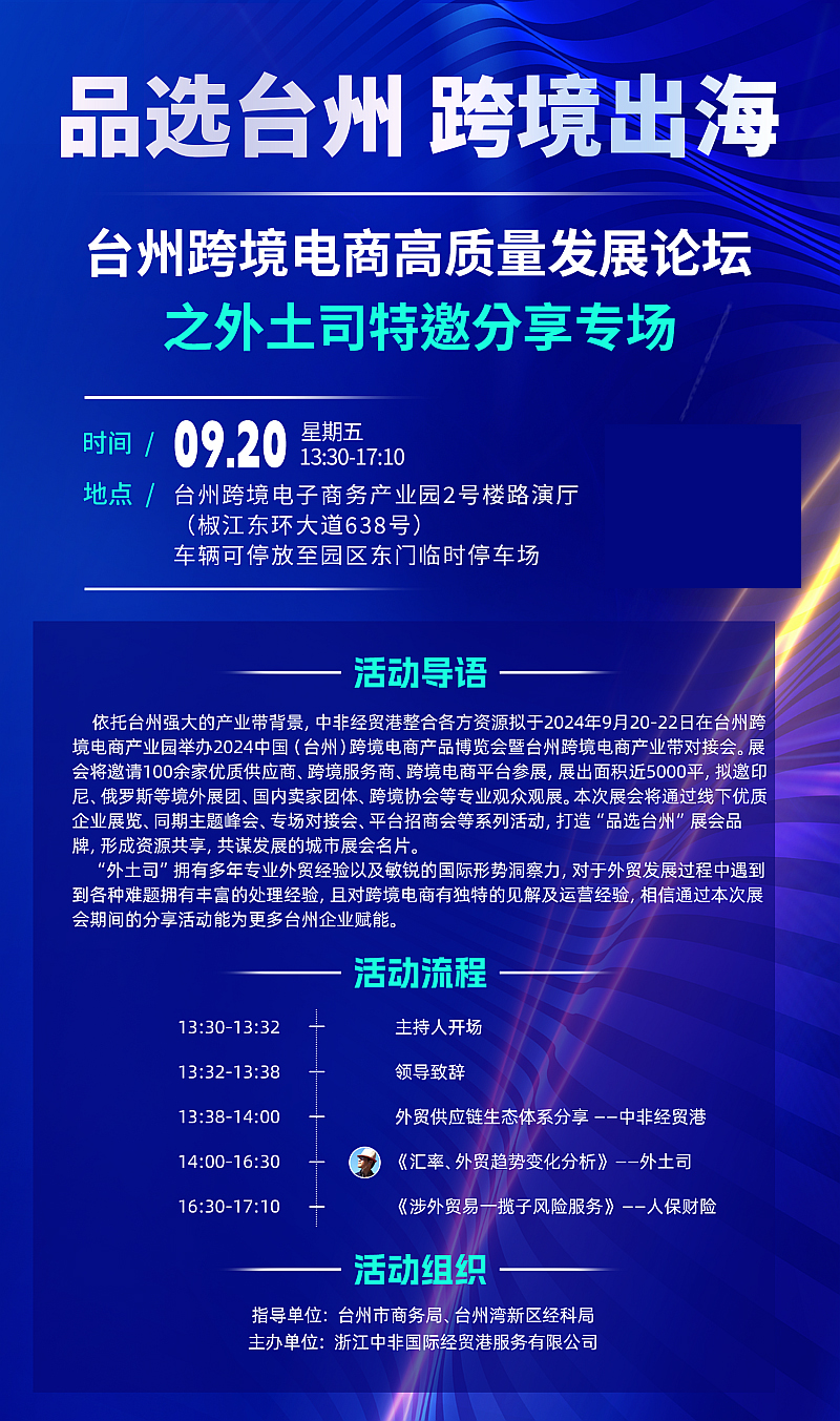 依托台州强大的产业带背景,中非经贸港整合各方资源拟于2024年9月20-22日在台州跨境电商产业园举办2024中国(台州)跨境电商产品博览会暨台州跨境电商产业带对接会。展会将邀请100余家优质供应商、跨境服务商、跨境电商平台参展,展出面积近5000平,拟邀印尼、俄罗斯等境外展团、国内卖家团体、跨境协会等专业观众观展。本次展会将通过线下优质企业展览、同期主题峰会、专场对接会、平台招商会等系列活动,打造“品选台州”展会品牌,形成资源共享,共谋发展的城市展会名片。“外土司”拥有多年专业外贸经验以及敏锐的国际形势洞察力,对于外贸发展过程中遇到到各种难题拥有丰富的处理经验,且对跨境电商有独特的见解及运营经验,相信通过本次展会期间的分享活动能为更多台州企业赋能。
