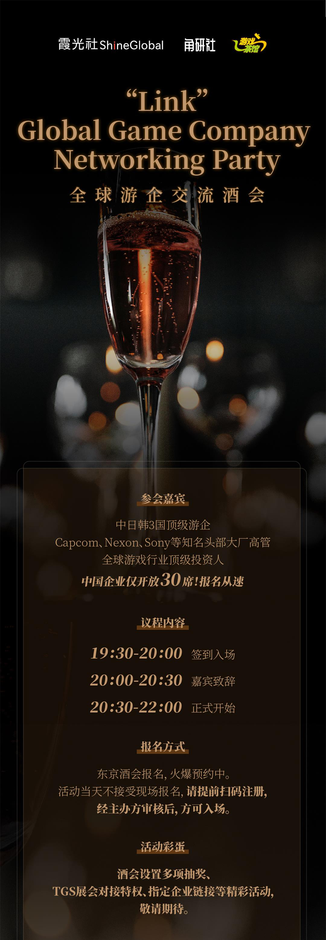 霞光社将于9月25日东京核心区域开办一场游戏人自己的酒会。在这里,我们将邀请Capcom、Nexon、Sony等知名头部大厂本地高管、中日双方的游戏行业顶级投资人以及日本市场各方面顶级解决方案服务商一同参会,搭建一个游戏人独享的增长交流平台,让合作,更容易。
