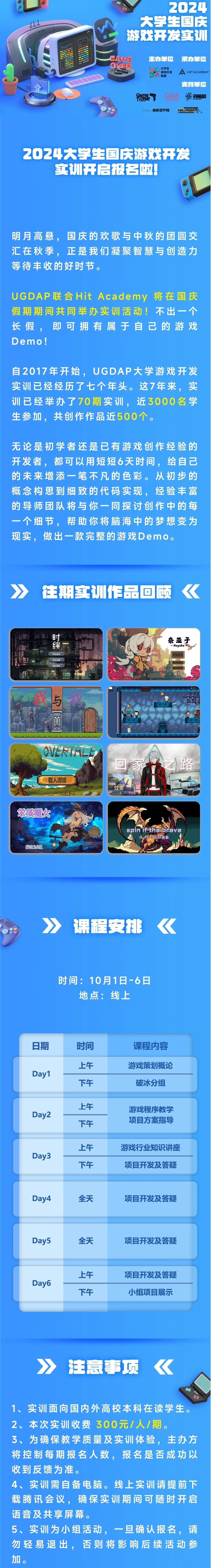 无论是初学者还是已有游戏创作经验的开发者,都可以用短短6天时间,给自己的未来增添一笔不凡的色彩。从初步的概念构思到细致的代码实现,经验丰富的导师团队将与你一同探讨创作中的每一个细节,帮助你将脑海中的想变为现实,做出一款完整的游戏Demo。