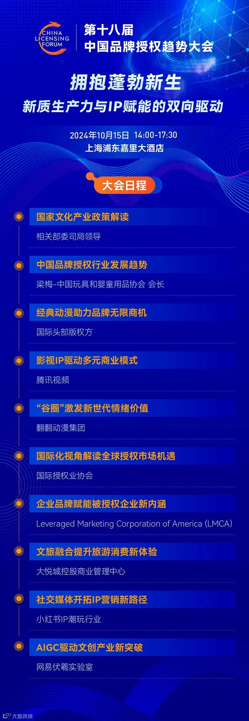 在此行业背景下,中国玩具和婴童用品协会将于10月15日在CLE中国授权周举办第十八届中国品牌授权趋势大会。大会以“拥抱蓬勃新生 - 新质生产力与IP赋能的双向驱动”为主题,邀请相关部委司局领导、国际授权业协会、国际头部版权方、版权代理方、被授权商、商业地产、衍生品企业及视频、社媒平台等共同探讨新质生产力与IP如何双向为产业赋能。