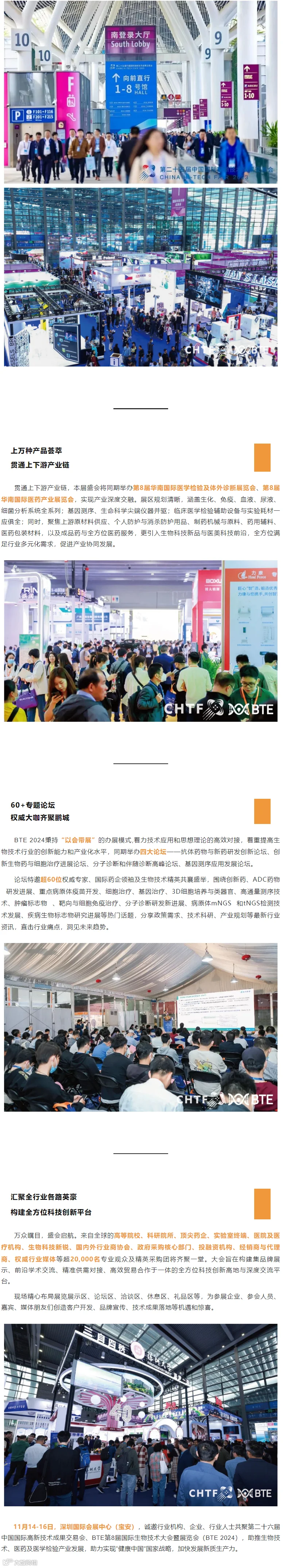 第二十六届高交会经国务院批准,由深圳市人民政府主办,展览面积约40万平方米,预计将有来自100余个国家和地区的5,000余家知名企业与国际组织参展。其中,BTE国际生物技术大会展览范围涵盖实验室技术及设备、生物技术服务、工程技术装备、生物制品与新兴疗法、医学检验及IVD、质量控制及安全六大版块,共享高交会超50万人次的专业观众。