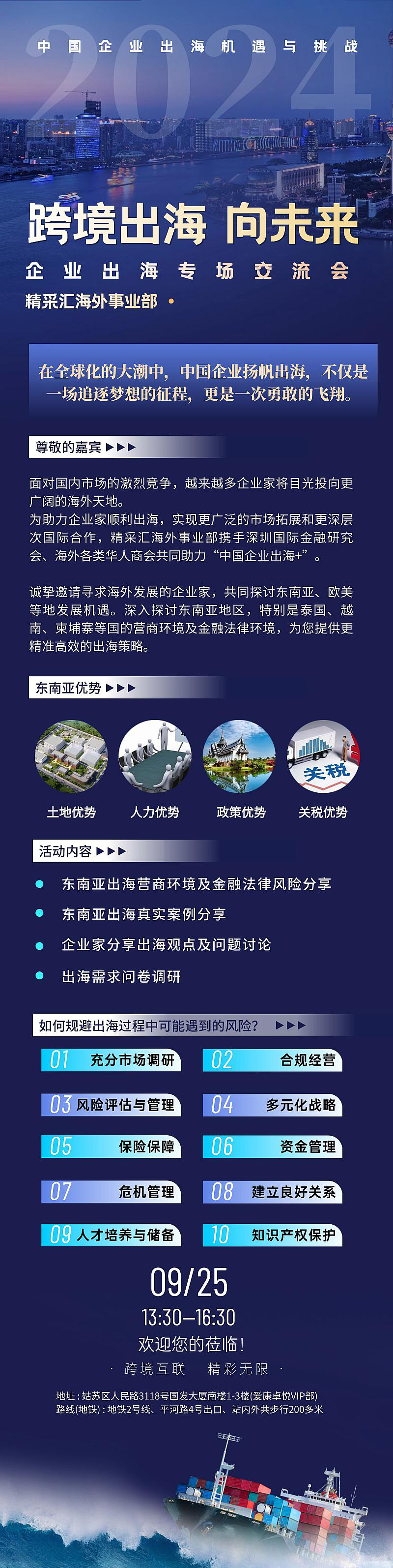 面对国内市场的激烈竞争,越来越多企业家将目光投向更广阔的海外天地。为助力企业家顺利出海,实现更广泛的市场拓展和更深层次国际合作,精采汇海外事业部携手深圳国际金融研究会、海外各类华人商会共同助力“中国企业出海+”