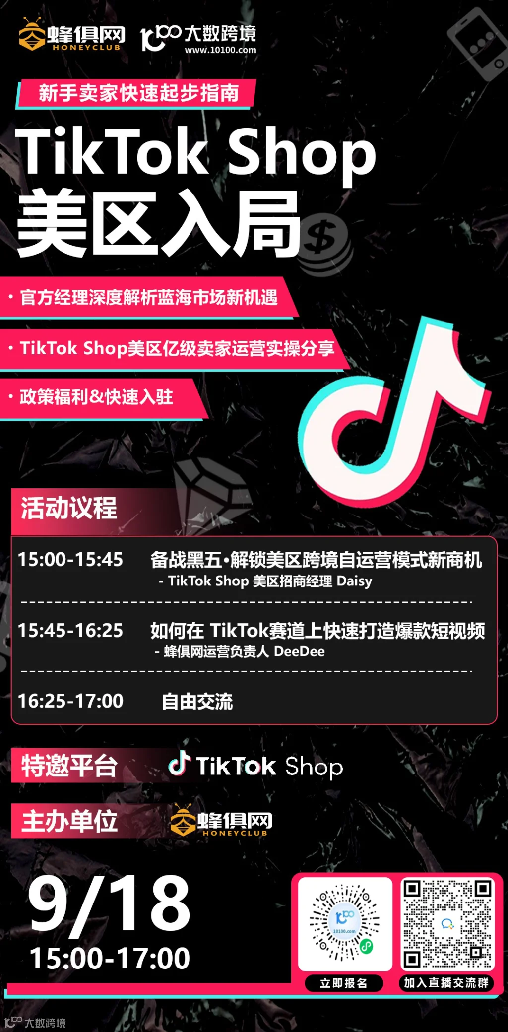 【直播预告】蜂俱网带你入局TikTok Shop美区! ⏰ 9月18日 15:00-17:00 🌟 官方经理深度解析 &亿级卖家实操分享 🎁 快速入驻 & 政策福利扫码入群也可以领取专属福利哦!
