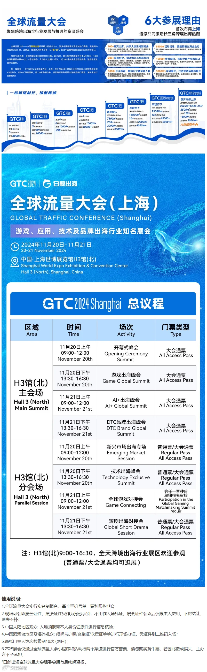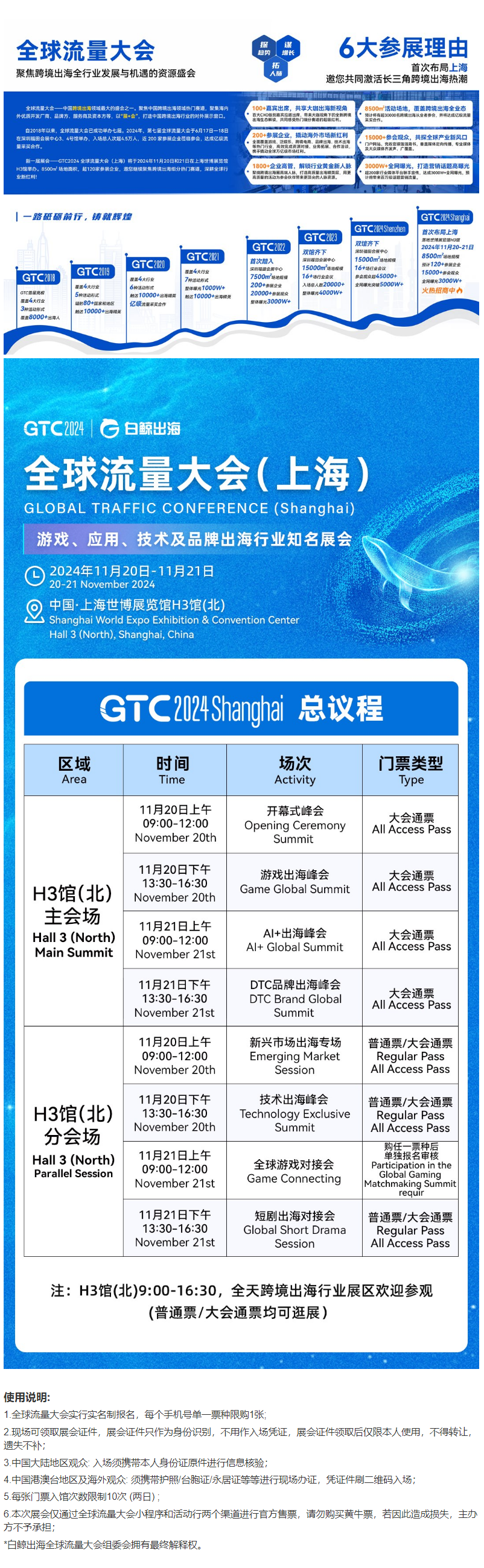 早鸟票-大会通票 - 说明:(1)跨境出海行业展区通行 (2)主会场、分会场通行 (3)跨境出海行业资源手册x1 (4)跨境出海行业数据报告合集(会后请咨询白鲸客服:baijing022 获取电子版)(5)白鲸出海官网个人会员月卡(价值100元)x1