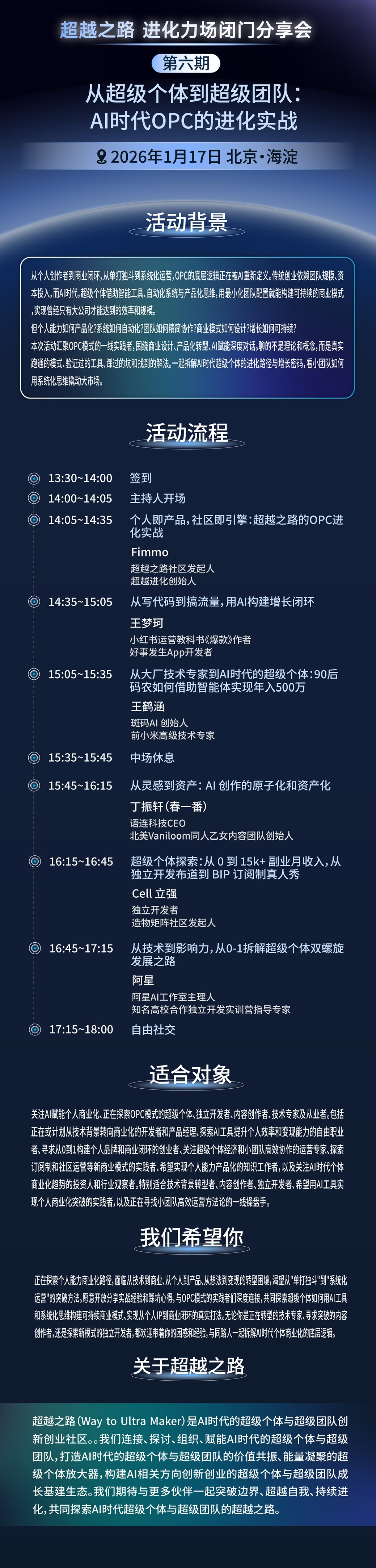 超越之路社区将于1月17日(本周六)下午在北京中关村创业大街举办「进化力场」第六期线下闭门分享会,本期活动由中关村科学城公司、中信书店特别支持。本期活动围绕"从超级个体到超级团队:AI时代OPC的进化实战"这一主题,邀请五位AI出超级个体与OPC的一线实践者,分享真实跑通的商业模式与验证过的AI工具。从年入500万的90后码农转型,到15k+副业月收入的独立开发实战,从AI创作资产化到订阅制真人秀运营,全方位拆解超级个体进化密码。不讲理论概念,只聊实战经验、踩坑心得和系统化解法,帮你找到从技术到商业、从个产品的突破方法。