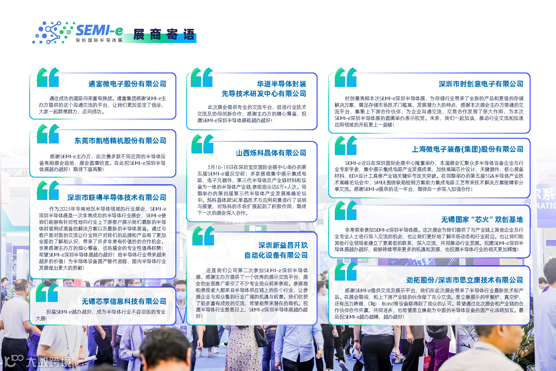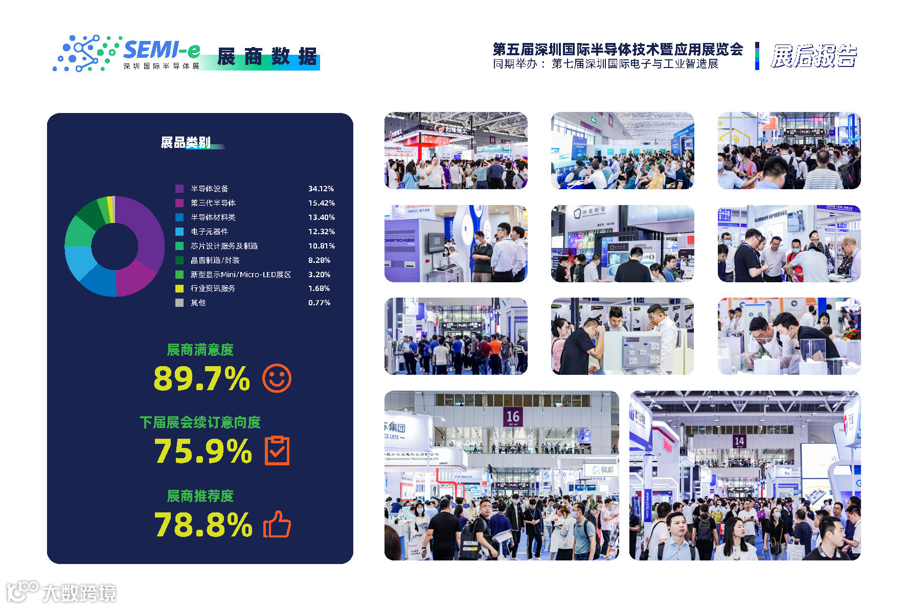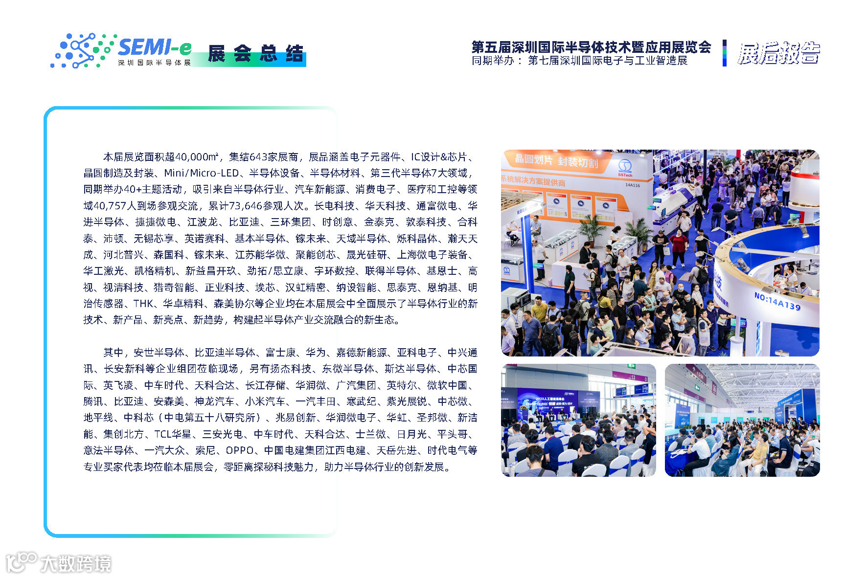 上届SEMI-e展览面积超40,000㎡,集结643家展商,展品涵盖电子元器件、IC设计&芯片、晶圆制造及封装、Mini/Micro-LED、半导体设备、半导体材料、第三代半导体7大领域,同期举办40+主题活动,吸引来自半导体行业、汽车新能源、消费电子、医疗和工控等领域40,757人到场参观交流,累计73,646参观人次。长电科技、华天科技、通富微电、华进半导体、捷捷微电、江波龙、比亚迪、三环集团、时创意、金泰克、敦泰科技、合科泰、沛顿、无锡芯享、英诺赛科、基本半导体、镓未来、天域半导体、烁科晶体、瀚天天成、河北普兴、森国科、镓未来、江苏能华微、聚能创芯、晟光硅研、上海微电子装备、华工激光、凯格精机、新益昌开玖、劲拓/思立康、宇环数控、联得半导体、基恩士、高视、视清科技、猎奇智能、正业科技、埃芯、汉虹精密、纳设智能、思泰克、恩纳基、明治传感器、THK、华卓精科、森美协尔等企业均在本届展会中全面展示了半导体行业的新技术、新产品、新亮点、新趋势,构建起半导体产业交流融合的新生态。