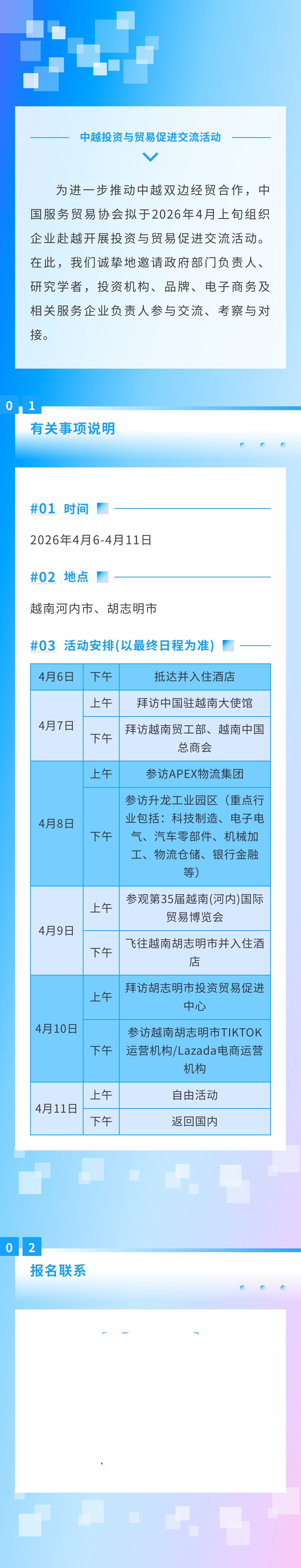 为进一步推动中越双边经贸合作,中国服务贸易协会拟于2026年4月6日至4月11日组织企业赴越南河内市、胡志明市开展投资与贸易促进交流活动,包括拜访中国驻越南大使馆、越南贸工部、越南中国总商会,参访升龙工业园区,参观第35届越南(河内)国际贸易博览会,拜访胡志明市投资贸易促进中心,参访越南胡志明市TIKTOK运营机构/Lazada电商运营机构等。