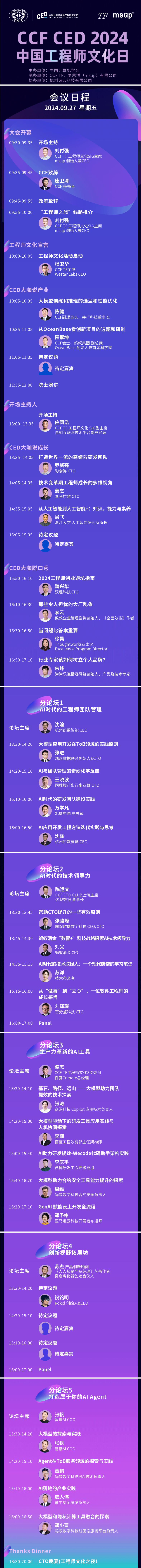 “第四届1024中国工程师文化日CCF CED 2024”,将于 9月27日在杭州召开。该技术文化与品牌盛会由CCF主办,麦思博(msup)有限公司承办,汇聚全球技术大咖和CTO。