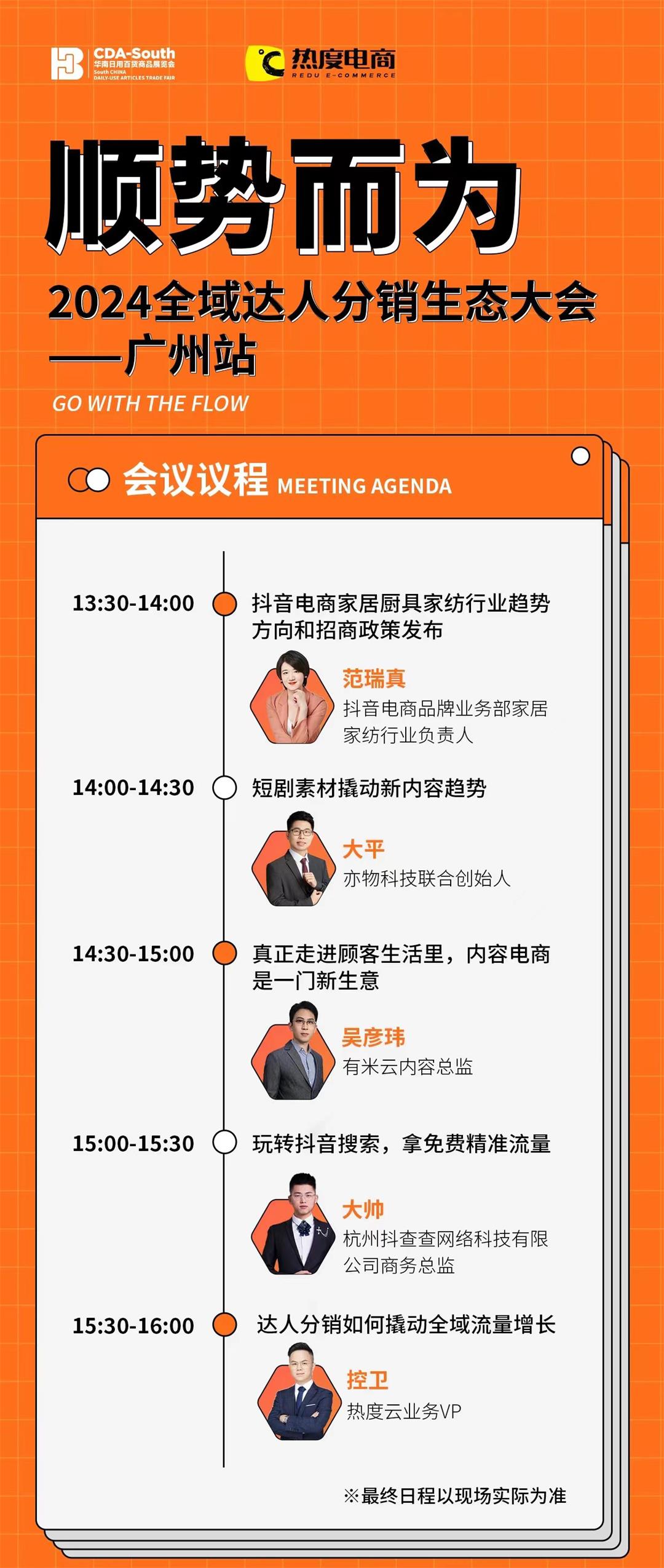 为助力探索解决以上难题,华南百货展联合热度电商,举办2024全域达人分销生态大会·广州站,本届主题为「顺势而为」,邀请行业里有结果的操盘手,一起探讨分享成功经验、趋势预测、玩法干货。