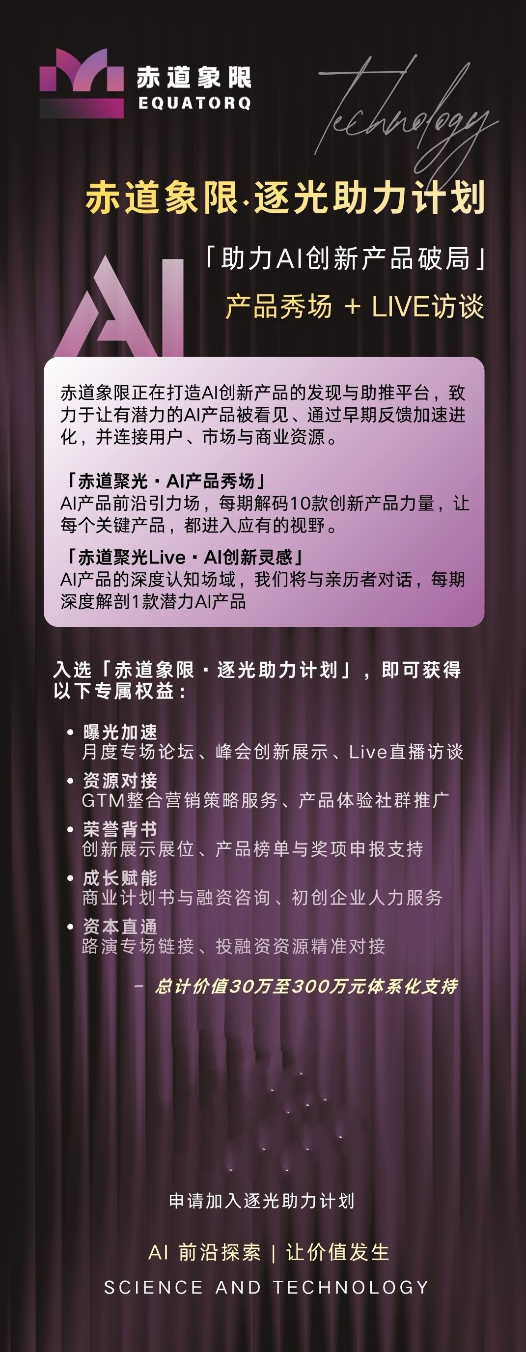 4个高潜力AI+游戏娱乐创新项目各获得15分钟黄金Showtime,直面技术实力、产品壁垒、商业化成效的严苛评估。获得本次活动创新展示资格的项目还可优先入选「赤道象限AI初创项目·逐光助力计划」,获取技术资源、营销策略、团队培养和投资机会等支持。