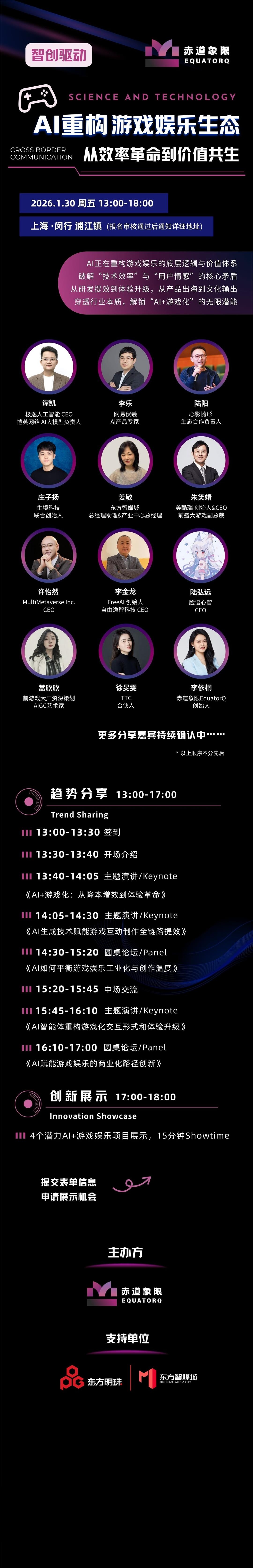 如何在AI赋能下,既提升制作效率,又保留甚至增强游戏娱乐的情感温度与艺术价值?1月30日赤道象限EquatorQ邀你共谈行业机遇。