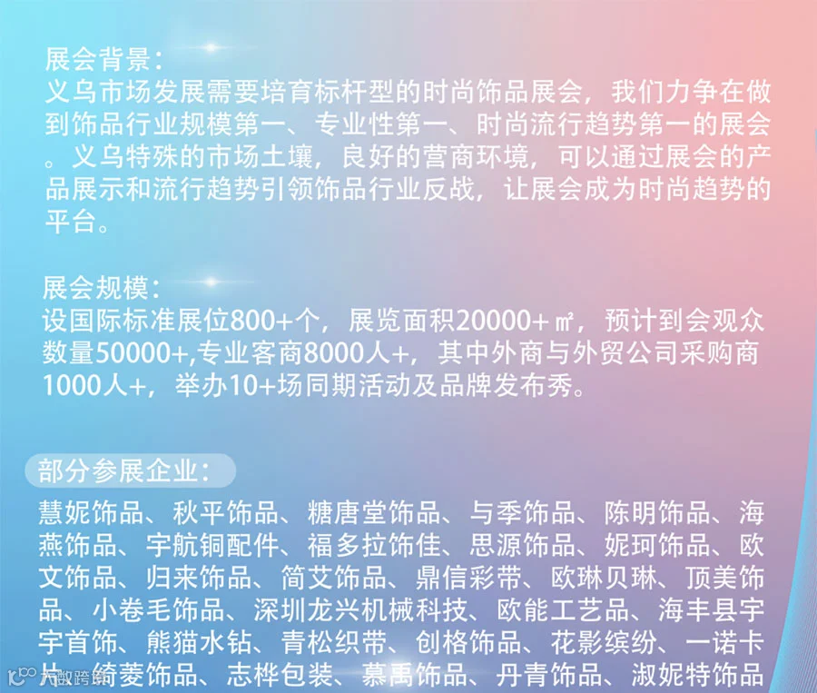 2025义乌时尚饰品展展览面积2万+,预计到会观众数量5万+,专业客商8000人以上,其中外商与外贸公司采购商1000人以上,举办10+场同期活动及品牌发布秀与2025整体流行趋势的发布会。2025年展位共计800+,饰品展将对展馆空间布局进行新的调整规划,优化展区布置为参展企业提供优质的服务。