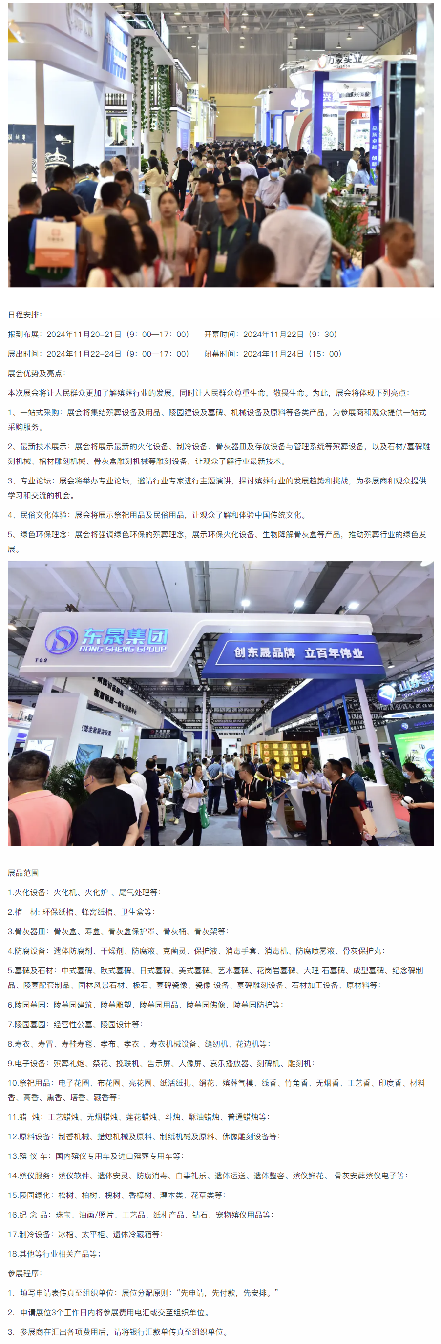 2024年华中国际殡仪文化及殡葬用品博览会将于2024年11月22-24日在湖南.长沙红星国际会展中心召开,本届展会以推动绿色殡葬、创文明新风尚为主题,预计参展商家200余家,展览面积15000平米,专业参观采购商25000人次。展品涉及殡仪文化、殡葬用品、陵园墓园、墓碑石材、火化设备、棺材、寿衣、祭祀用品、电子设备、制冷设备、殡仪车等相关行业产品