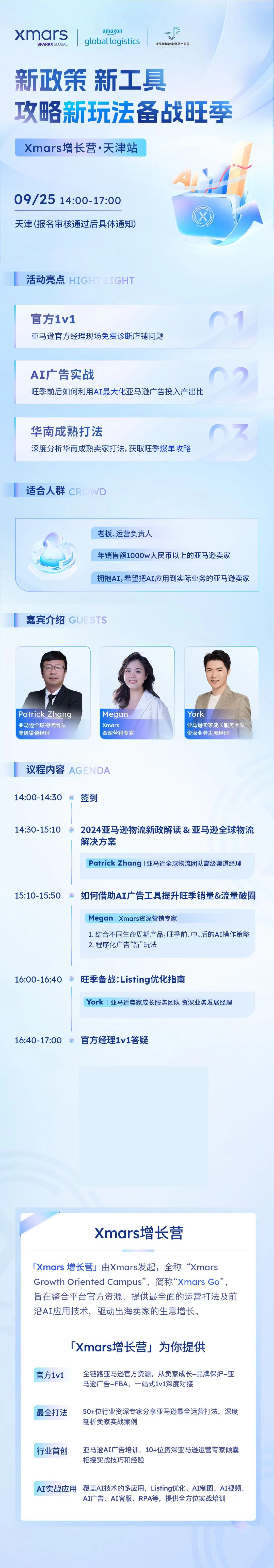 「Xmars 增长营」由Xmars发起,全称“XmarsGrowth Oriented Campus”,简称“Xmars Go“旨在整合平台官方资源、提供最全面的运营打法及前沿AI应用技术,驱动出海卖家的生意增长