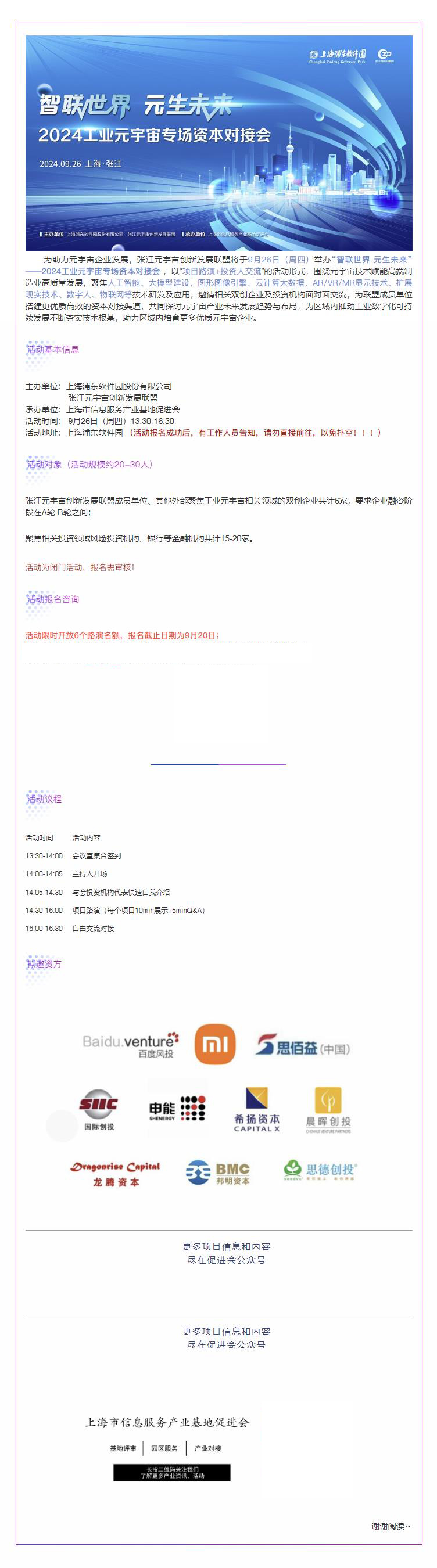 为助力元宇宙企业发展,张江元宇宙创新发展联盟将于9月26日(周四)举办“智联世界 元生未来” ——2024工业元宇宙专场资本对接会 ,以“项目路演+投资人交流”的活动形式,围绕元宇宙技术赋能高端制造业高质量发展,聚焦人工智能、大模型建设、图形图像引擎、云计算大数据、AR/VR/MR显示技术、扩展现实技术、数字人、物联网等技术研发及应用,邀请相关双创企业及投资机构面对面交流,为联盟成员单位搭建更优质高效的资本对接渠道,共同探讨元宇宙产业未来发展趋势与布局,为区域内推动工业数字化可持续发展不断夯实技术根基,助力区域内培育更多优质元宇宙企业。