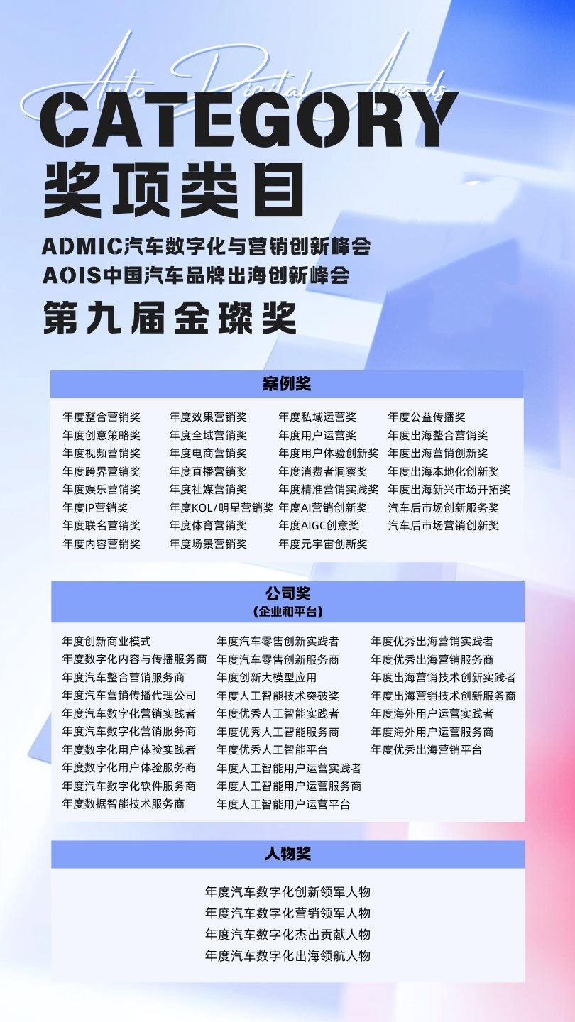 由iDigital China联合行业协会、汽车及营销数字化专业媒体与权威代表共同发起。与ADMIC汽车数字化与营销创新峰会、AOIS中国汽车品牌出海创新峰会同期举办,是汽车行业数字化及营销领域极具影响力的专业赛事。本届金璨奖以“智驱 · 跃境”为主题,相较于往届,在奖项设置上实现精准升级——新增人工智能、出海相关细分类目,如年度AI营销创新奖、年度AIGC创意奖、年度出海本地化创新奖、年度出海新兴市场开拓奖等,全面覆盖当下汽车数字化营销核心领域与技术创新方向,更精准匹配企业多元化的创新实践成果。