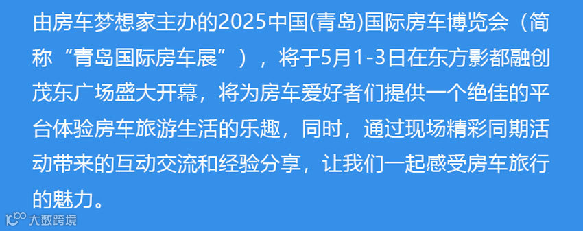 2025年第三届青岛国际房车旅游产业博览会(简称:青岛国际房车展)定档五一黄金周!5月1日-5月3日,将在“青岛东方影都融创茂东广场”盛大开幕!本次青岛国际房车展将汇聚众多知名房车品牌,覆盖进口房车、国产房车、B型房车、C型房车、拖挂式房车、轻卡、重卡房车、升顶房车、新能源房车、皮卡房车、商务车等在内的数百款房车整车让您一次看过瘾,价格涵盖数万至百万不等,满足房车用户对于多样化购车需求。现场可以免费试乘试驾,先体验,再购买。另外还有配件+户外露营装备,满足您一站式购车体验。