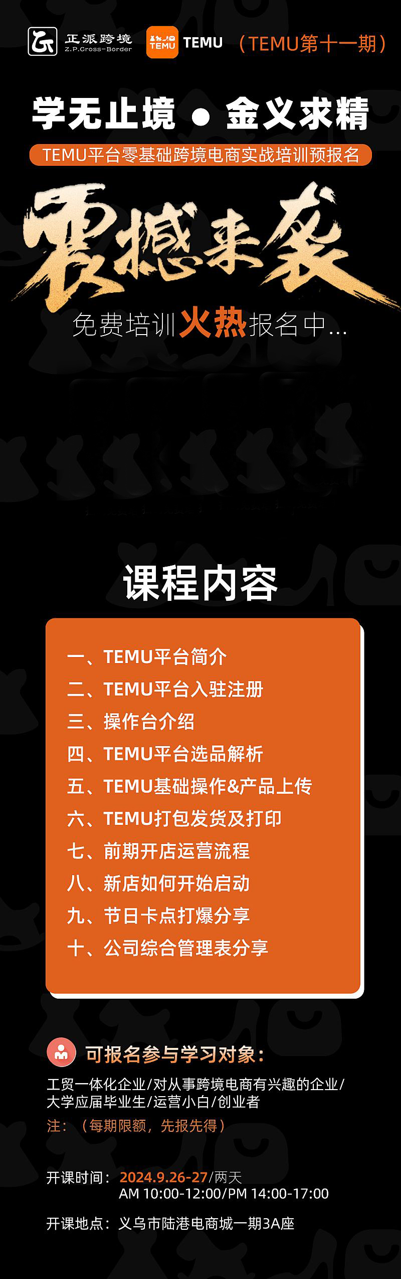 9月26-27日2天线下【TEMU】学无止境●金义求精 0基础跨境电商TEMU培训班第11期