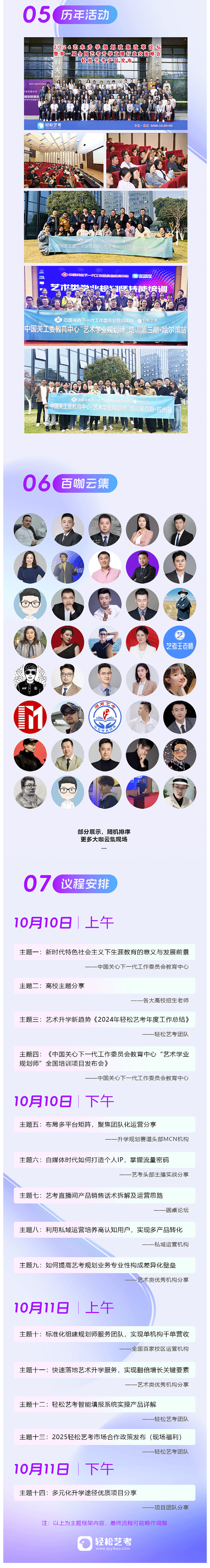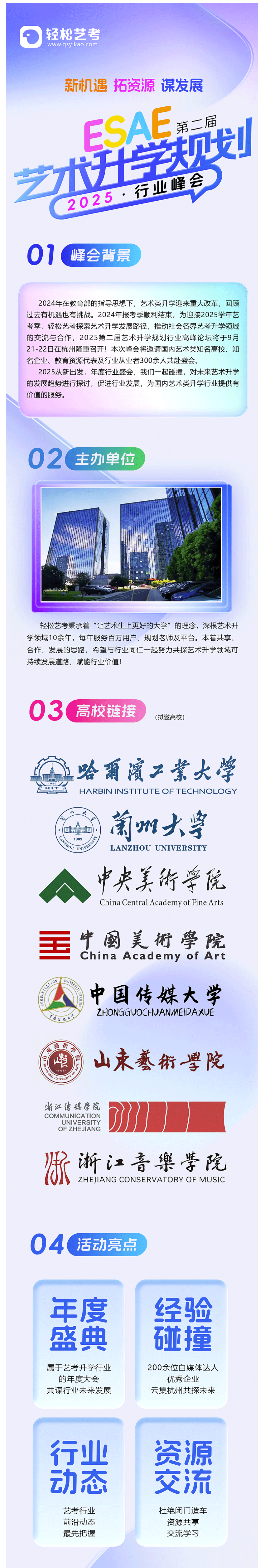 2024年在教育部的指导思想下,艺术类升学迎来重大改革,回顾过去有机遇也有挑战。2024年报考季顺利结束,为迎接2025学年艺考季,轻松艺考探索艺术升学发展路径,推动社会各界艺考升学领域的交流与合作,2025第二届艺术升学规划行业高峰论坛将于9月21-22日在杭州隆重召开!本次峰会将邀请国内艺术类知名高校、知名企业、教育资源代表及行业从业者300余人共赴盛会。2025从新出发,年度行业盛会,我们一起碰撞,对未来艺术升学
