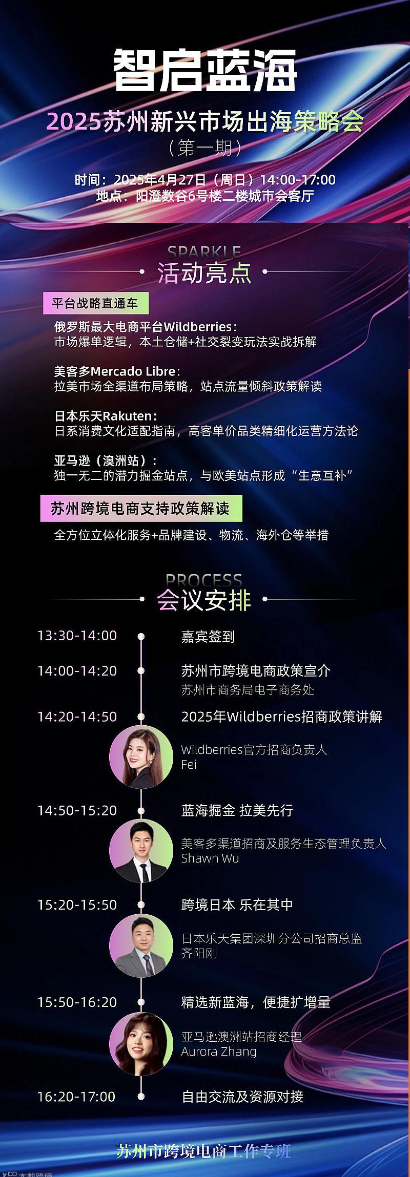为加快拓展新兴市场,拟举办“智启蓝海”2025苏州新兴市场出海策略会,本期活动拟邀请Wildberries、Mercado Libre、Rakuten等潜力平台分享最新出海策略,整合苏州制造业优势与新兴市场渠道资源,助力苏品苏货“上平台、卖全球”。