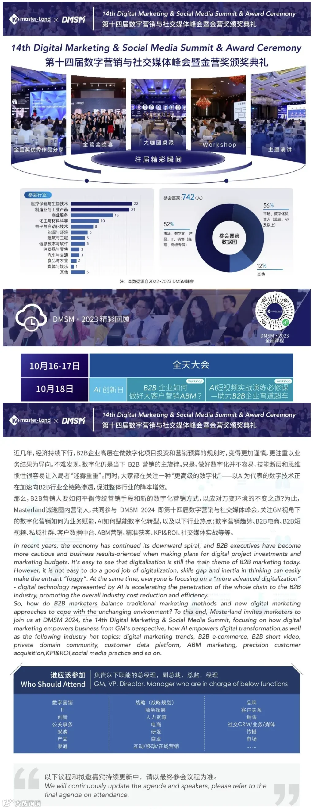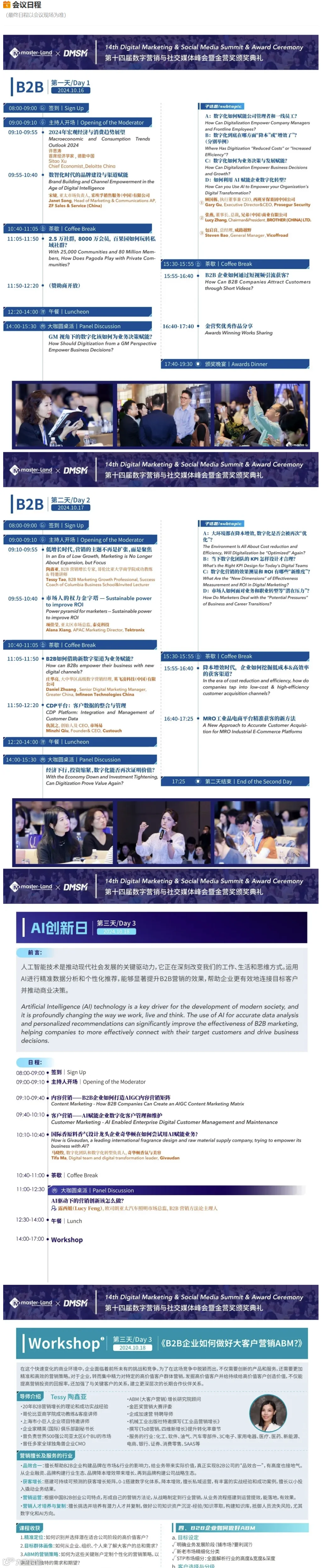 那么,B2B 营销人要如何平衡传统营销手段和新的数字化营销方式,以应对万变环境的不变之道?为此,Masterland诚邀圈内营销人,共同参与 DMSM 2024-第十四届数字营销与社交媒体峰会暨金营奖颁奖典礼 ,关注GM视角下的数字化营销如何为业务赋能,AI如何赋能数字化转型,以及以下行业热点:数字营销趋势、B2B电商、B2B短视频、私域社群、客户数据中台、ABM营销、精准获客、KPI&ROI、社交媒体实战等等。