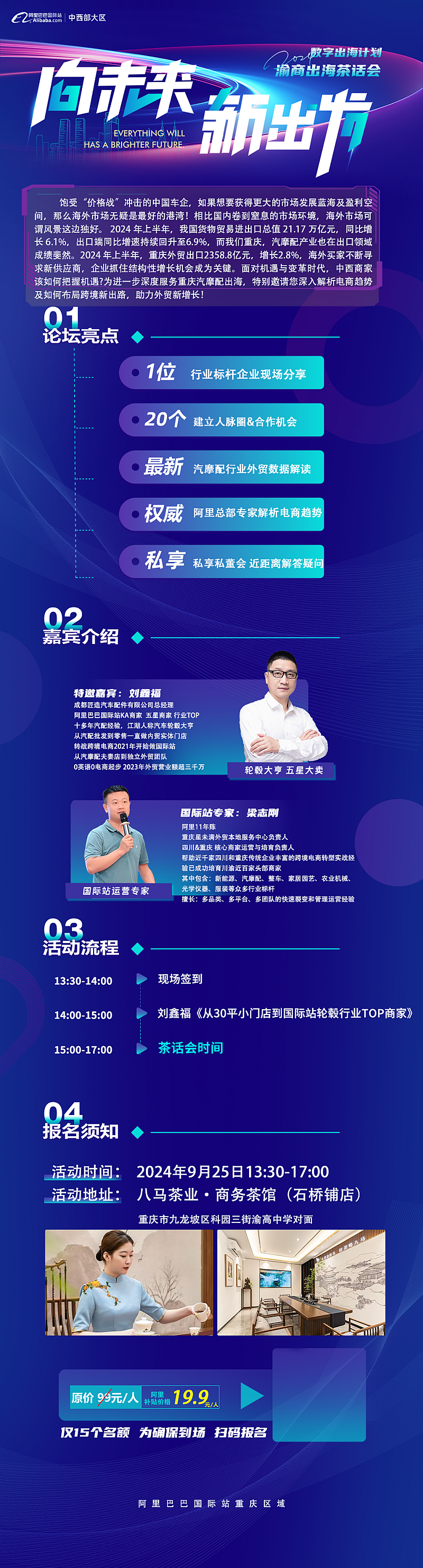 饱受“价格战”冲击的中国车企,如果想要获得更大的市场发展蓝海及盈利空间,那么海外市场无疑是最好的港湾!相比国内卷到窒息的市场环境,海外市场可谓风景这边独好。 2024年上半年,我国货物贸易进出口总值 21.17 万亿元,同比增长 6.1%,出口端同比增速持续回升至6.9%,而我们重庆,汽摩配产业也在出口领域成绩斐然。2024年上半年,重庆外贸出口2358.8亿元,增长2.8%,海外买家不断寻求新供应商,企业抓住结构性增长机会成为关键。面对机遇与变革时代,中西商家该如何把握机遇?为进一步深度服务重庆汽摩配出海,特别邀请您深入解析电商趋势及如何布局跨境新出路,助力外贸新增长!